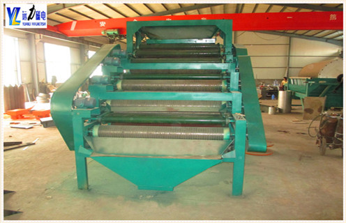 1、強磁輥式磁選機采用Q235或DT4材料制成的芯軸管,所述芯軸管上套裝有磁環、鐵環,所述磁環由釹鐵硼材料制成,所述鐵環由Q235材料制成,所述芯軸管兩端分別螺裝有將芯軸管兩端封閉的軸頭,所述軸頭由不銹鋼材料制成,所述軸頭上螺裝有用于將磁環和鐵環壓緊的螺母;所述磁環包括正極磁環和負極磁環,相鄰兩個鐵環之間設有兩個極性相反的磁環,且每個鐵環兩側的磁環的極性相同。