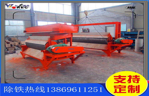 4、含有鐵磁性雜質(zhì)的物料通過受料斗經(jīng)電磁振動給料機均勻的下到第一道輸送皮帶上,當物料通過強磁輥時,鐵磁性物質(zhì)被磁力吸引被吸附到強磁輥上,隨著皮帶的轉(zhuǎn)動使其從磁場脫離并落入收集斗中。其它物料和沒有選凈的鐵磁性物質(zhì)隨溜槽進入下一級磁選皮帶進行分選,原理同上。最后選出合格的產(chǎn)品。